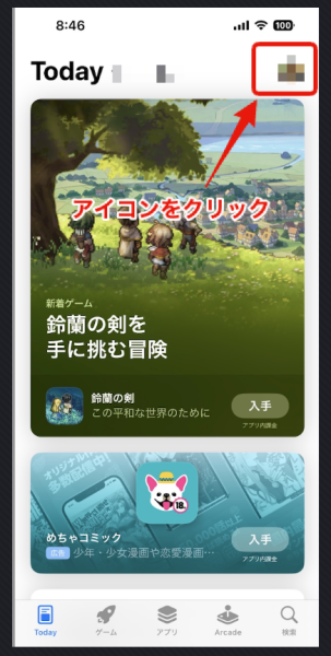 App Storeアプリを開き、右上にあるアイコンをタップし、アカウントメニューを開きましょう。
