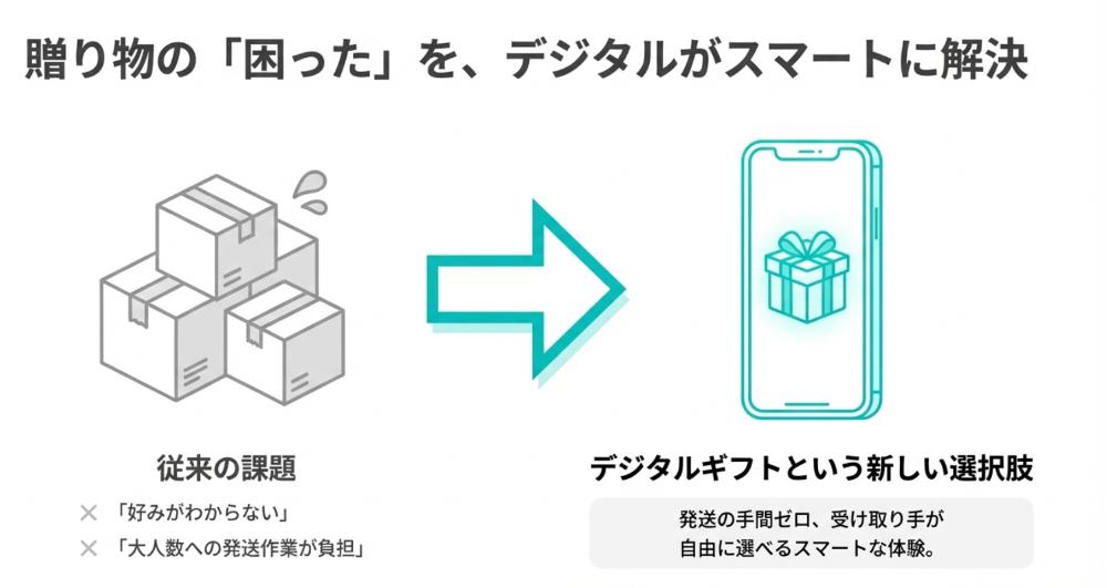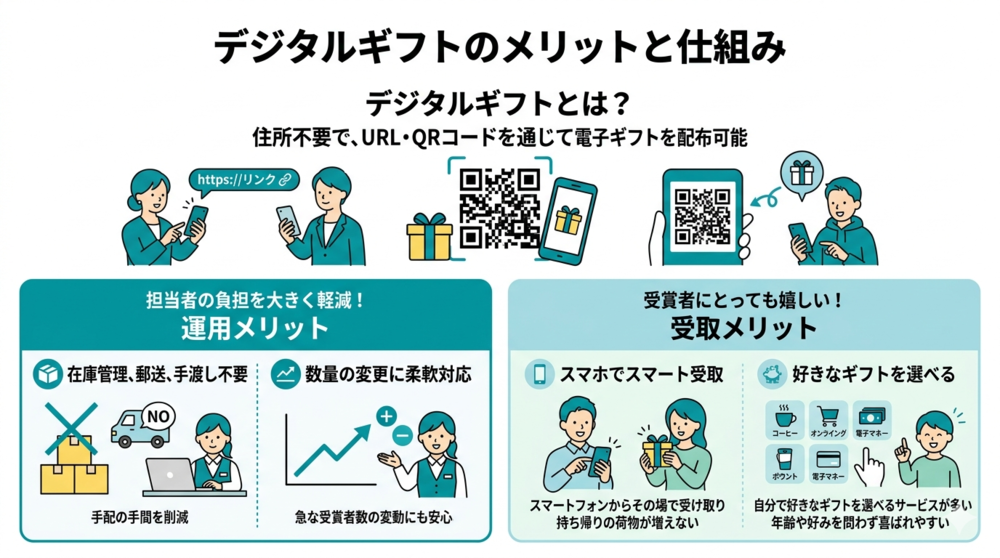 現物のギフトと違い、在庫管理や郵送、当日の手渡し準備が不要なため、担当者の負担を大きく軽減できます。