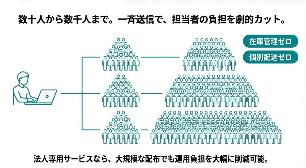 発注から配布までWeb上で完結するため、在庫管理や郵送作業が不要になり、担当者の負担も大きく軽減できます。