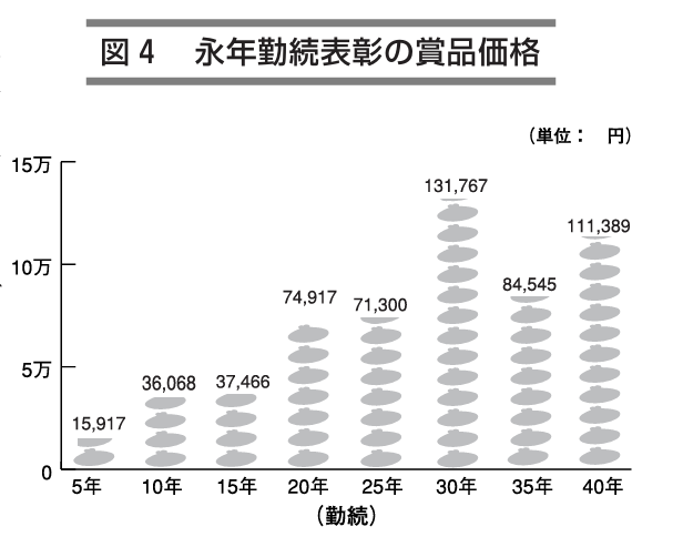 例えば、産労総合研究所が約2,000社を対象に実施した調査によると、永年勤続表彰の景品価格は以下です。