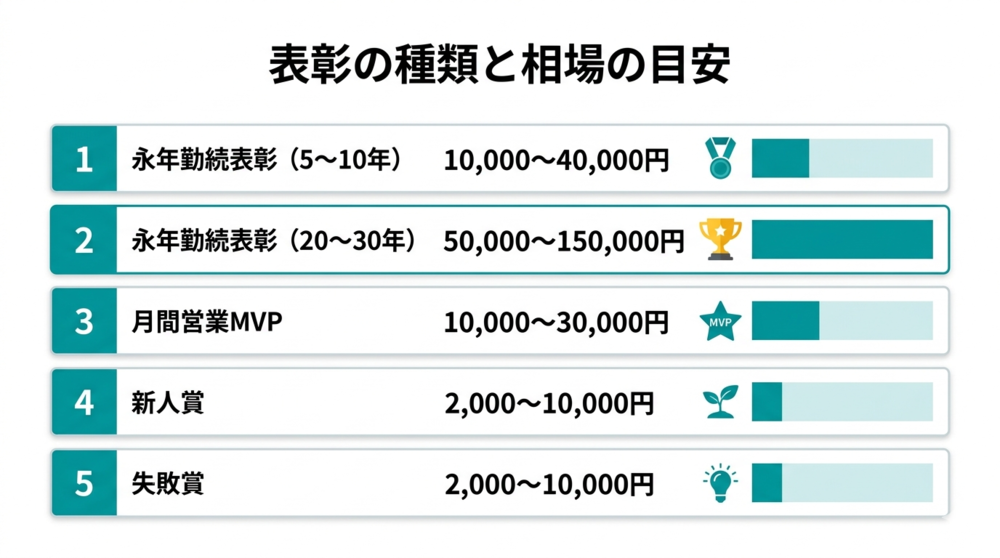 その他の社内表彰についても、表彰の種類ごとにある程度の相場感があります。目安としては、以下のとおりです。