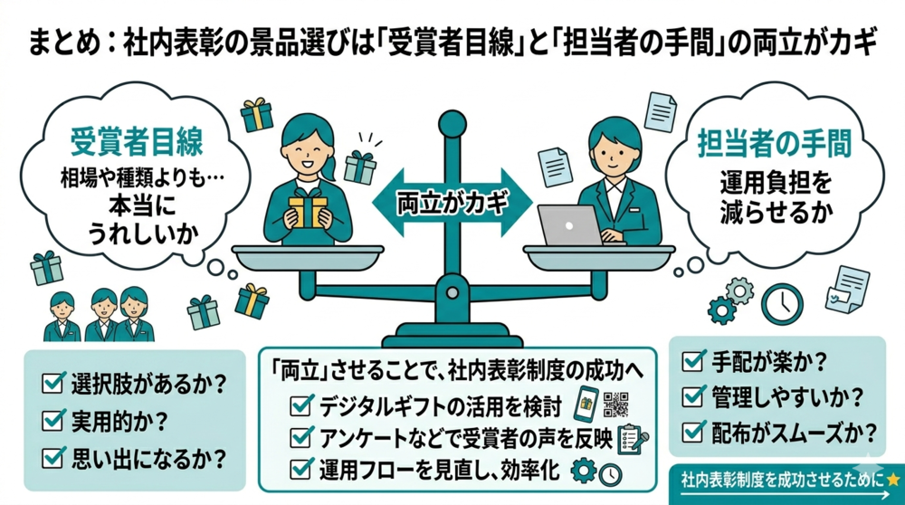 社内表彰の景品選びでは、相場や種類だけでなく、「受賞者にとって本当にうれしいか」と「担当者の運用負担を減らせるか」の両方を意識することが重要です。