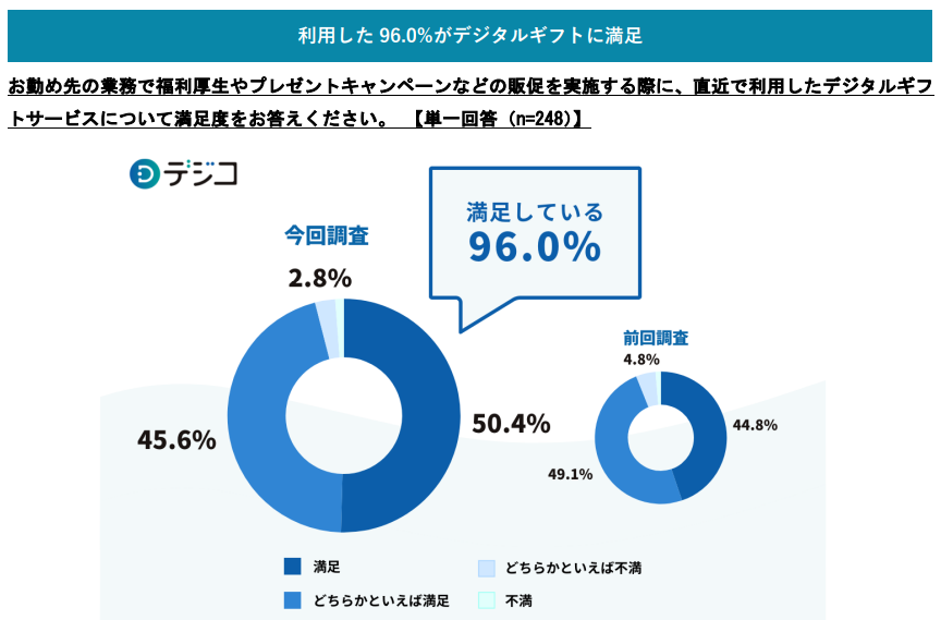 弊社が2024年におこなった調査では、デジタルギフトを利用した企業の96%が「満足」と回答しています。