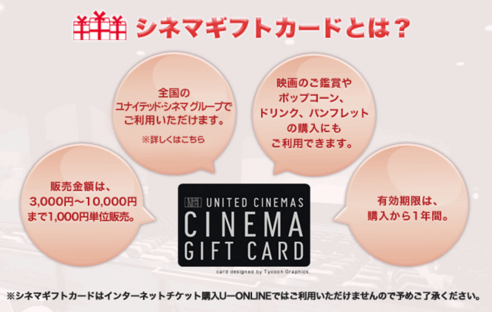 ユナイテッド・シネマ シネマギフトカードはインターネットでのチケット予約には使用できません。