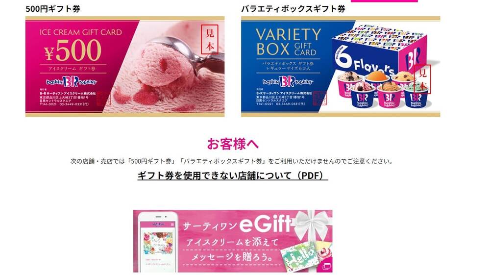 下記2種類のギフト券を、各サーティワン店舗で購入可能です。