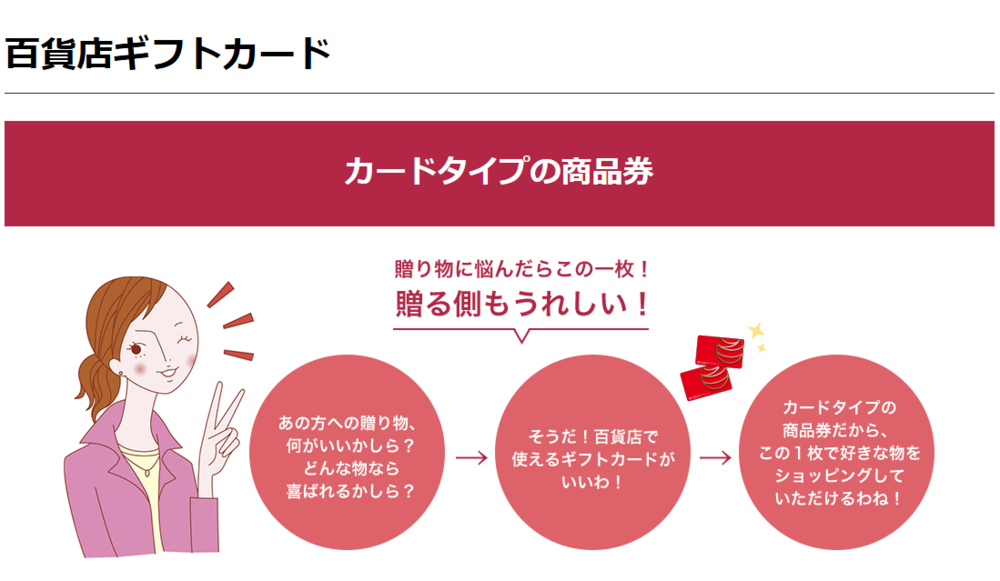 百貨店協会に加入している百貨店ならどの店舗でも購入でき、額面に満たない買い物でもお釣りが出ます。