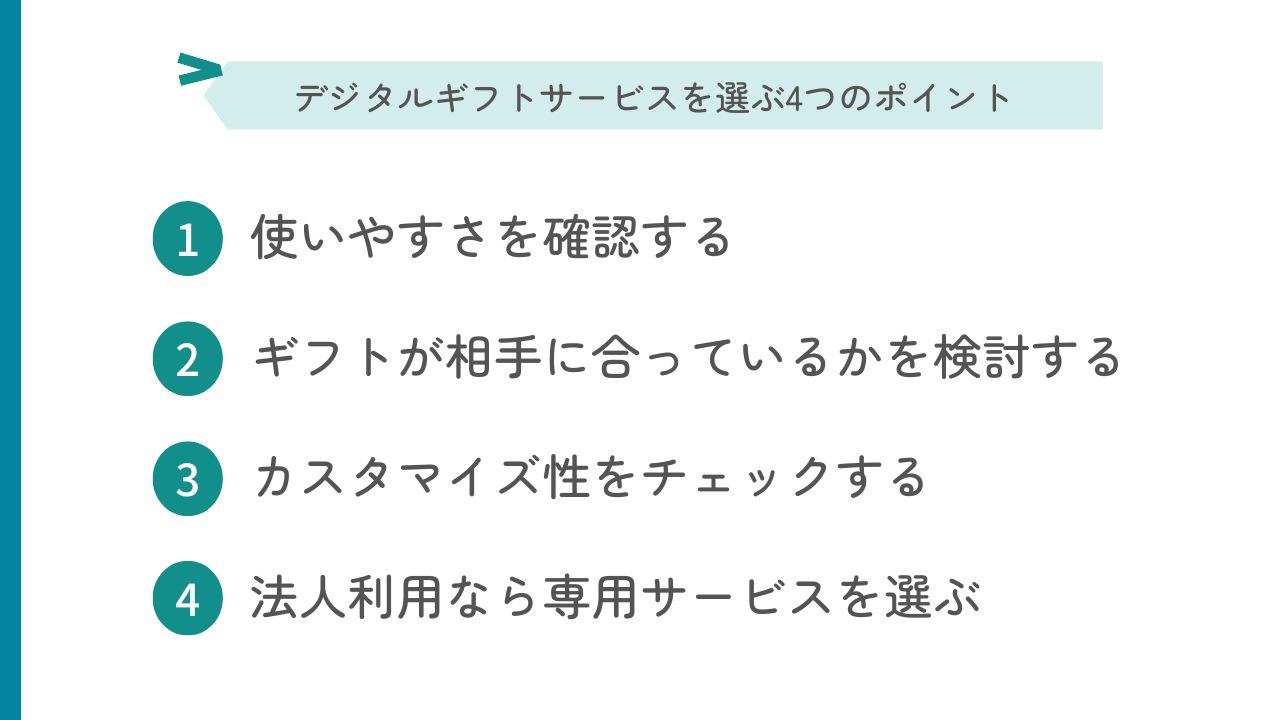 デジタルギフトはサービスごとに使い勝手や贈れる商品の種類、カスタマイズ性、法人向け機能などが異なるため、あらかじめチェックしておきたいポイントを把握しておくと安心です。