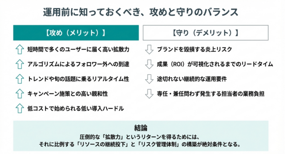一方で、炎上リスクなどの課題もありますが、投稿前のダブルチェック体制や、週単位の投稿スケジュールを整備しておくと、リスクを抑えながら無理のない運用がしやすくなります。