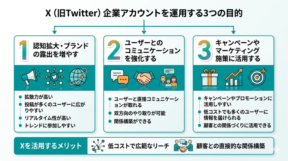企業がX(旧Twitter)の公式アカウントを運用する目的はさまざまですが、主に次の3つに分けられます。