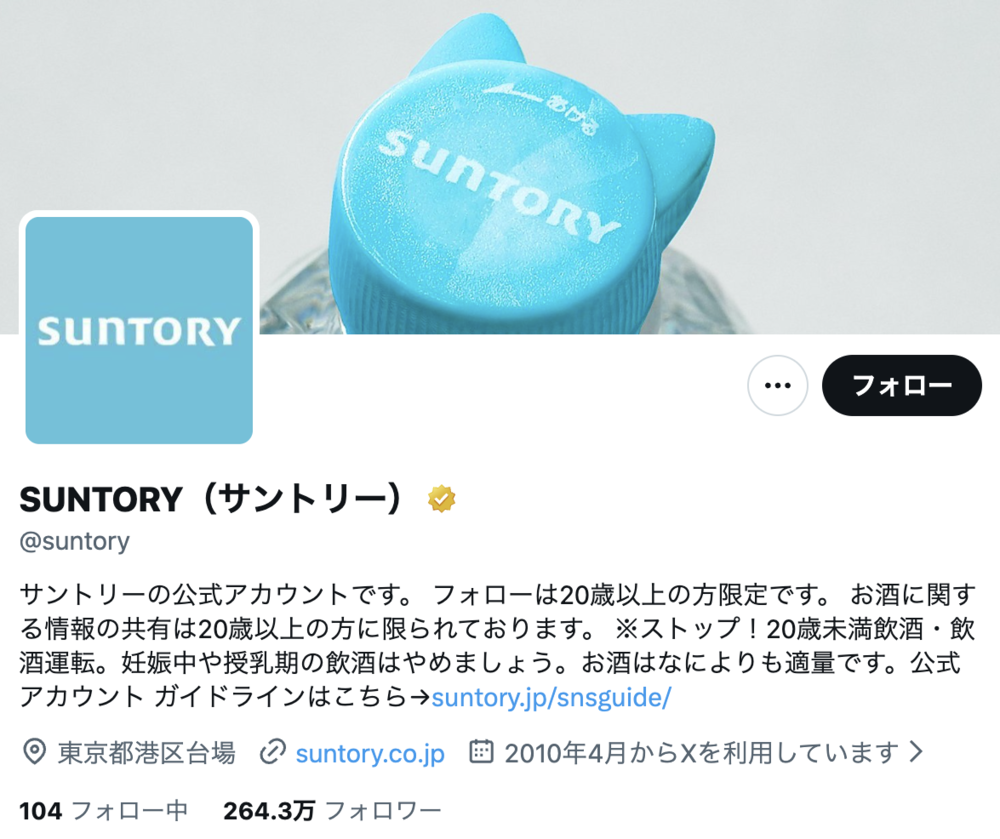 サントリーが運営するXの公式アカウントでは、新商品の紹介や季節限定商品の告知に加え、フォロー&リポストキャンペーンなどのプレゼント企画を積極的に実施しています。