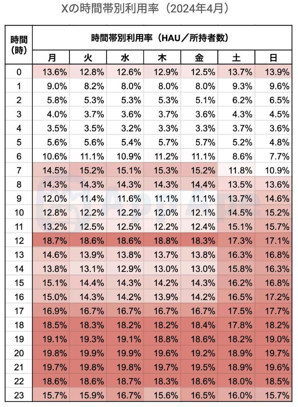 アプリ分析メディア「App Ape Lab」が解析した情報によると、Xの時間帯別利用率は次のような傾向があるとされています。