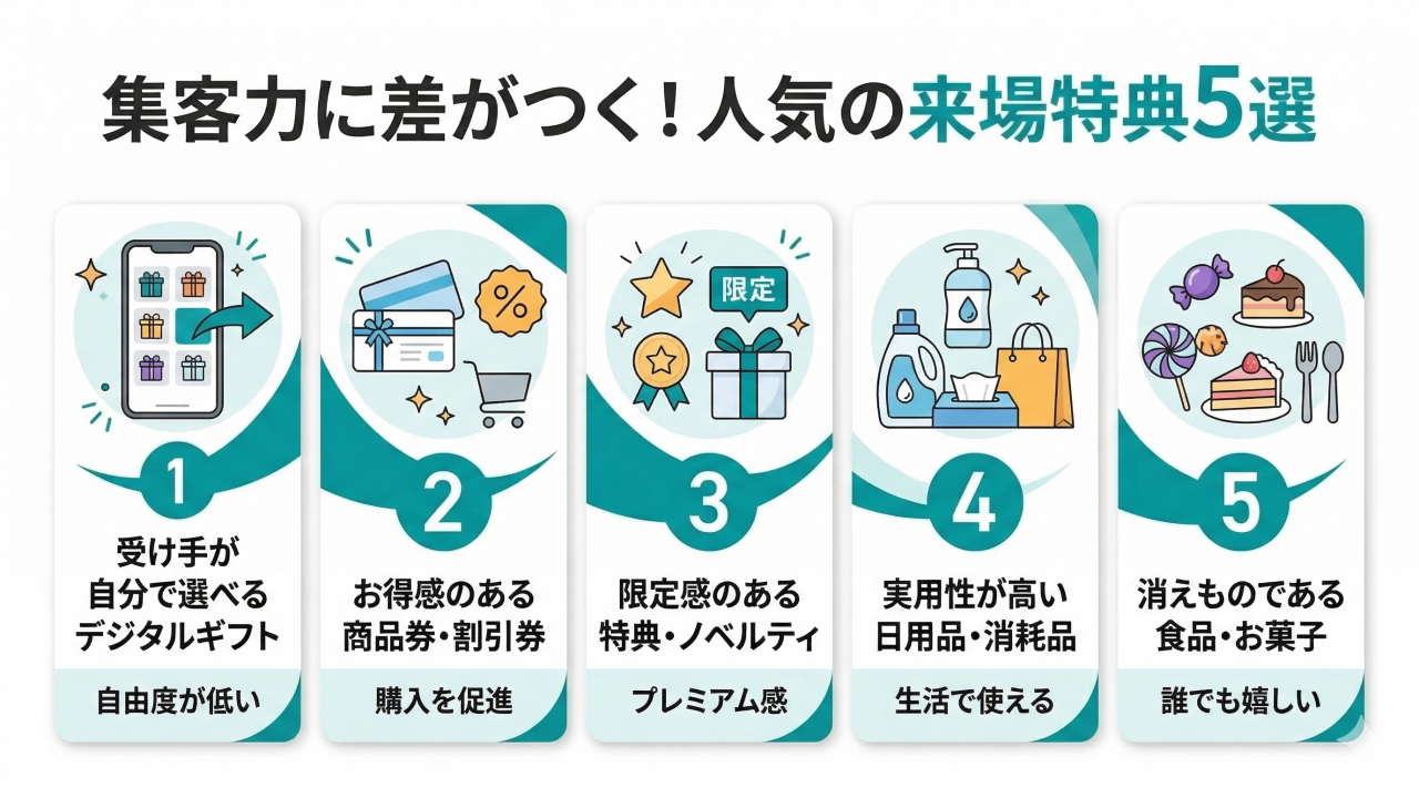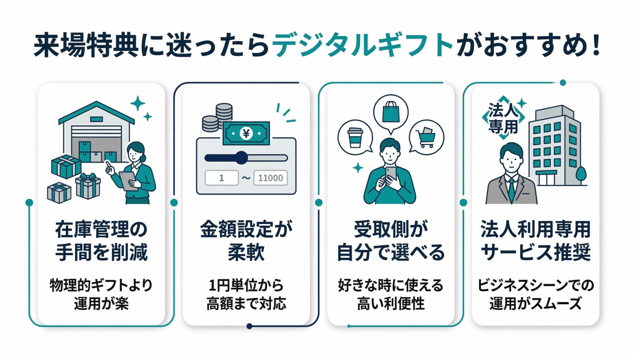 来場特典を選ぶ際には、物理的なギフトや商品券タイプよりも運用の手間がかからないデジタルタイプがおすすめです。
