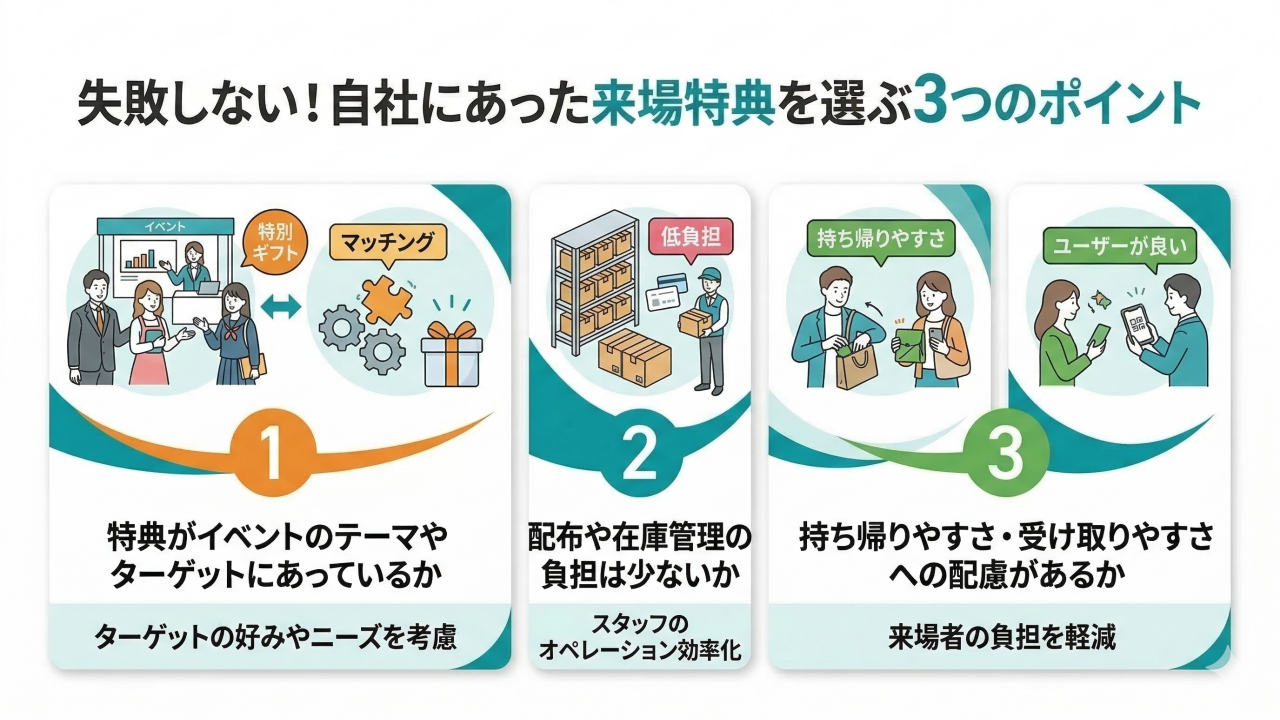 一方で、特典選びを誤ると、在庫管理や配布の手間が増えたり来場者に喜ばれなかったりと、負担がかかる結果になることもあります。