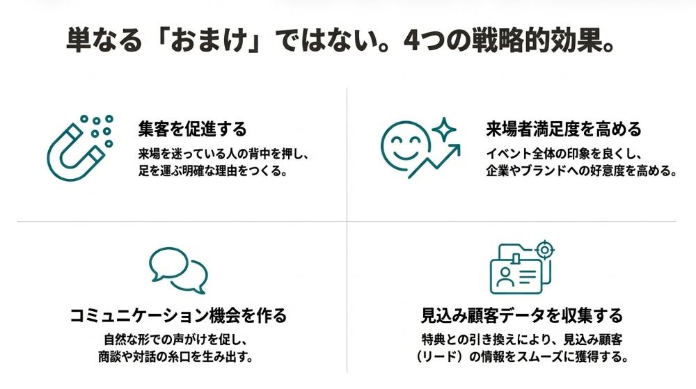 来場特典を用意することで、来場を迷っている人の背中を押す効果や自然な形で顧客情報を集めるきっかけになり、イベント全体の印象が良くなります。