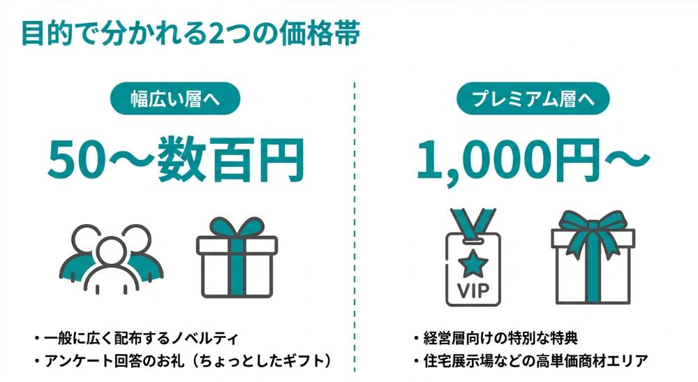 一方、経営層向けや住宅展示場の来場特典には、1,000円以上の商品券やギフトを用意するケースがあります。